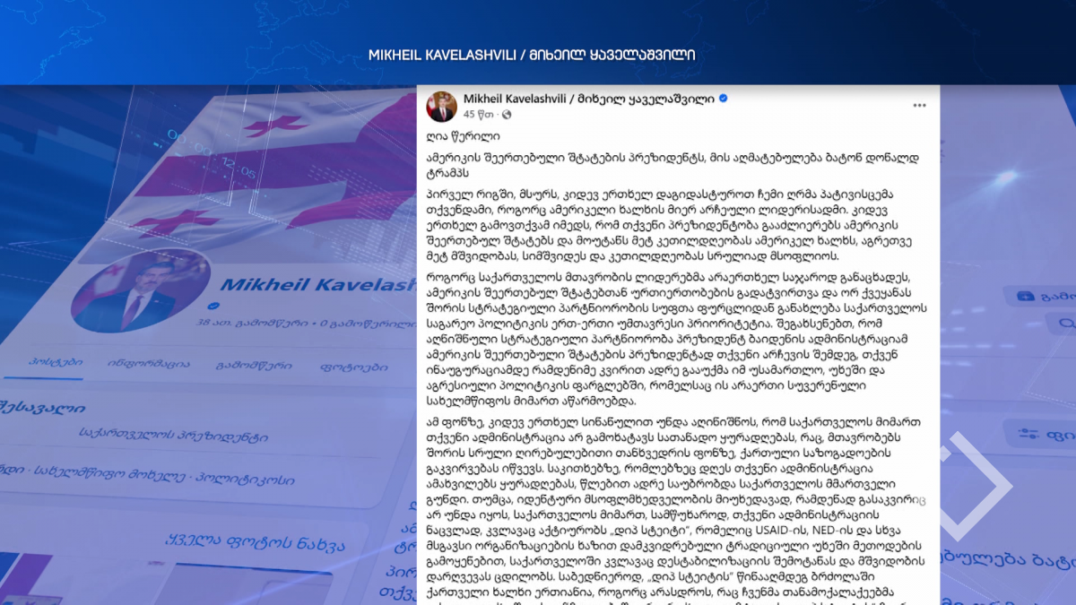 მიხეილ ყაველაშვილი დონალდ ტრამპს მიმართავს და ამერიკის პრეზიდენტის ადმინისტრაციის "უყურადღებობის" გამო წუხილს გამოთქვამს. ღია წერილში საქართველოს პრეზიდენტი კოლეგას ეუბნება, რომ...
